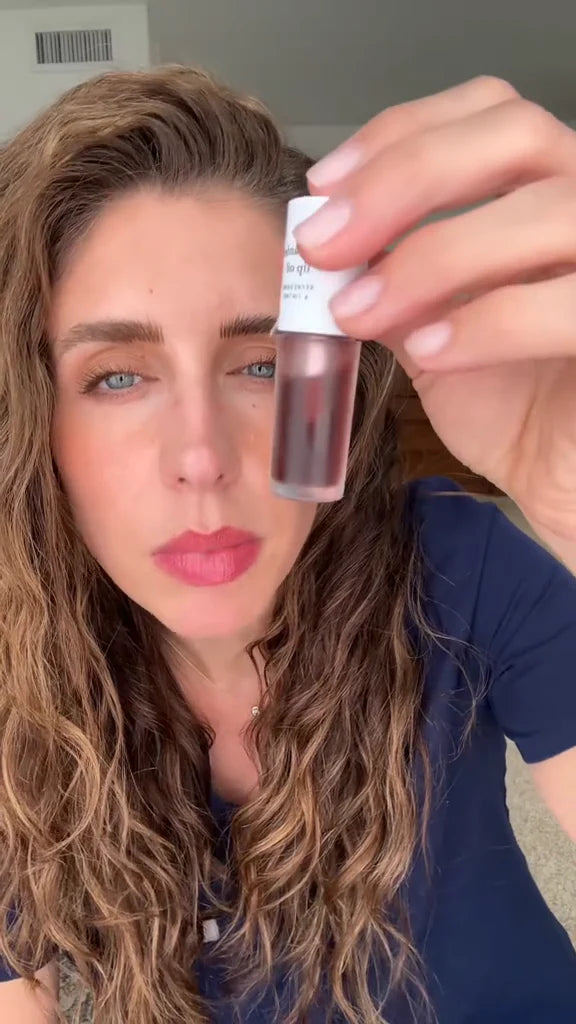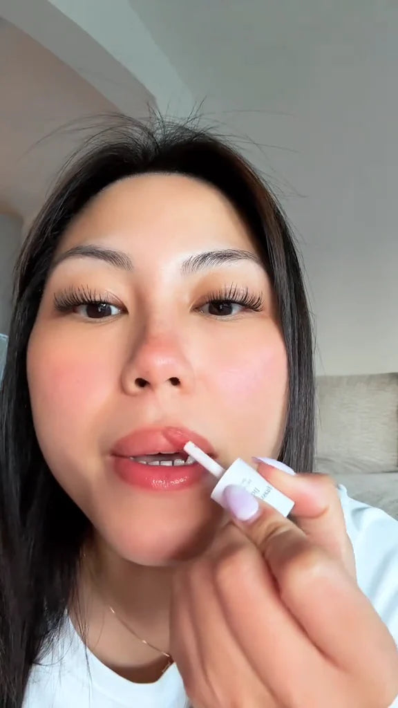Step 2. Apply the Lip Oil: Using the doe-foot applicator, swipe 1-2 drops of nooni lip oil stain evenly across your lips, adjusting the amount for your desired tint intensity