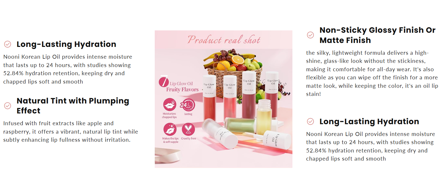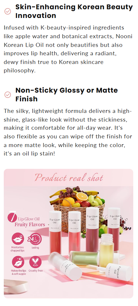 Our goal was simple:to create a lip product that effortlessly delivers a glossy, Korean-style pout, while giving giving a flawless lip stain for show. TheKorean Hydrating lip oil stainfeatures a silky, non-sticky formula with a precise doe-foot applicator for smooth, even application.Achieve hydrated, vibrant lips with just a few seconds of application, lasting throughout your day with a natural, kissable glow.