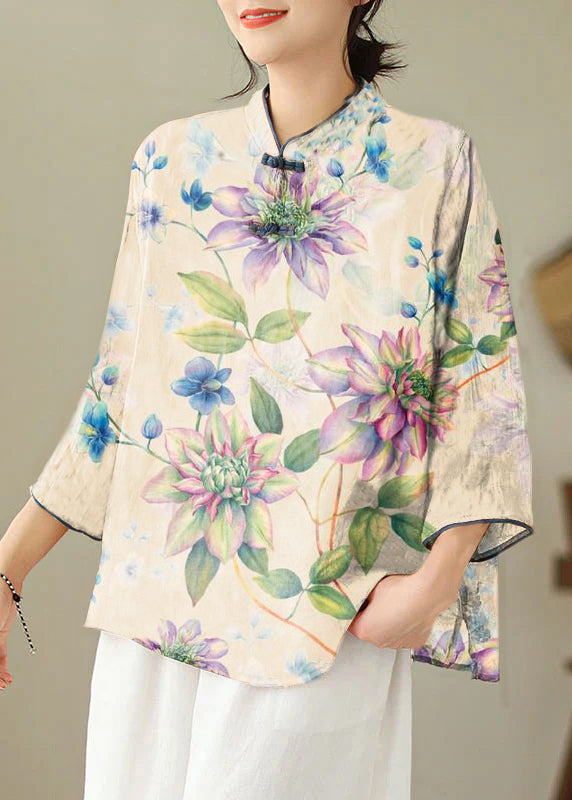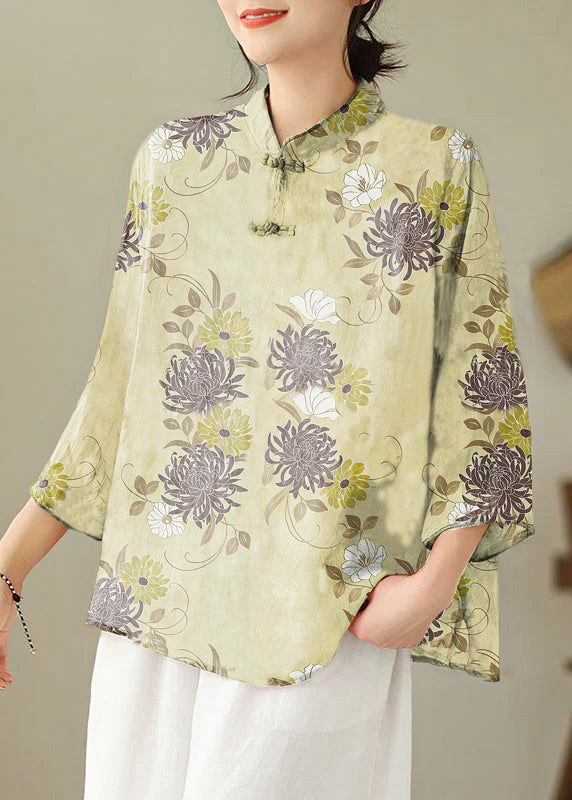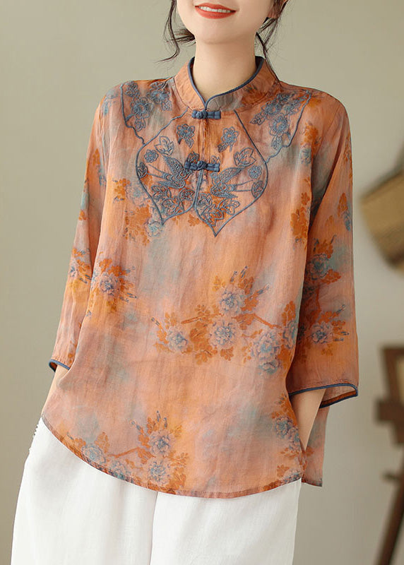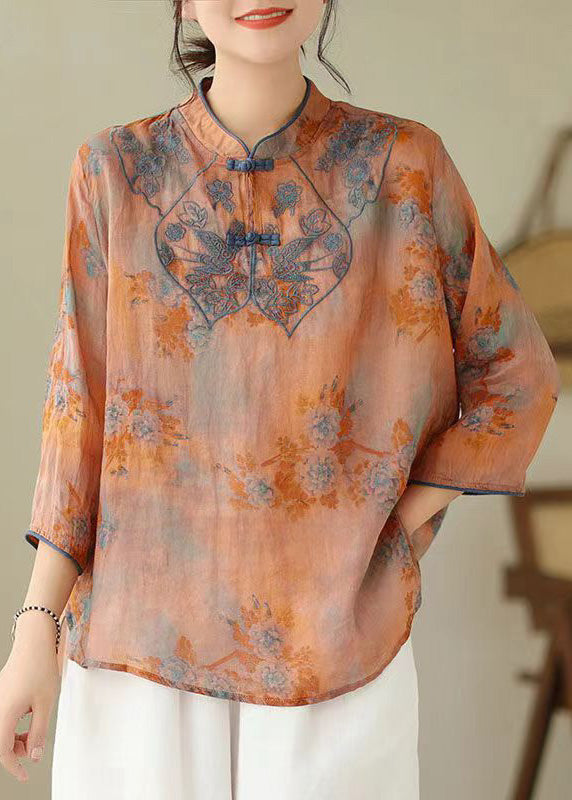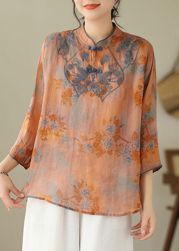 Loose Orange Stand Collar Embroideried Print Cotton Shirt Bracelet Sleeve
